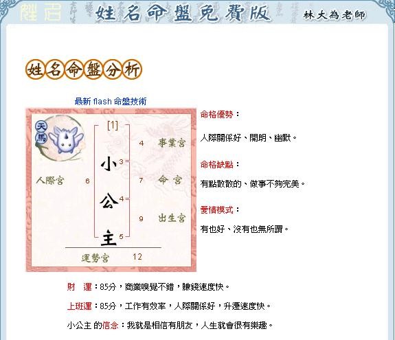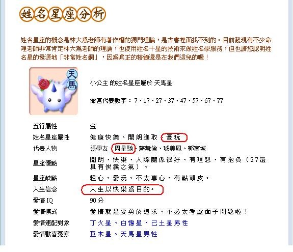 哈哈~這個還蠻準的耶 不死兔家看到的! 太準了阿! 沒錯!!周星馳就是我的代表阿!!噗~~ 人生果然是要以玩為目的 底下為算命網址 http://www.veryname.com.tw/fate/name/star/standard/