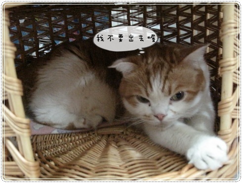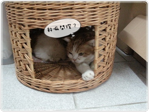 沒多久龐龐就跑去一個籃子躲起來~偷偷去拍他好了.....因為燈光太暗!所以一定要開燈拍...