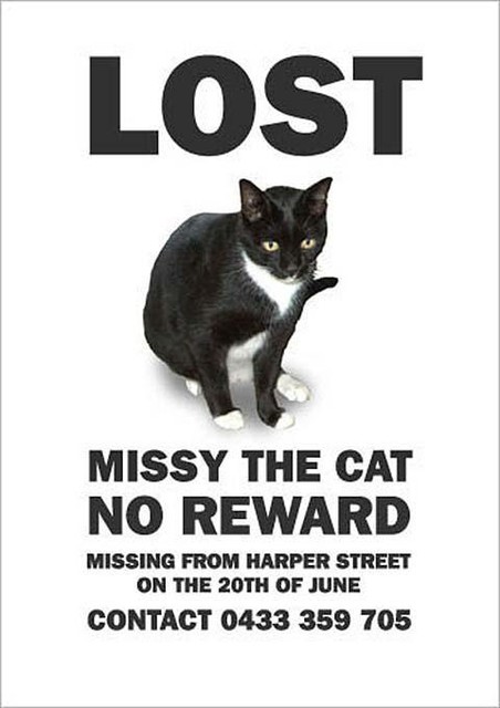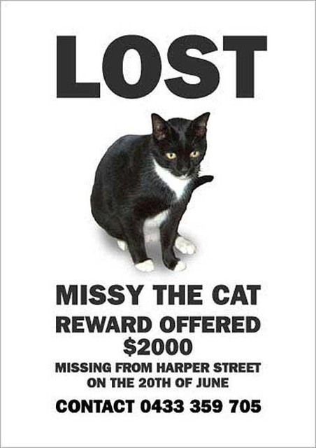 這比另一張還糟糕,你能不能就把蜜西的整張照片秀出來,然後刪掉那些什麼不見蜜西(missing missy)的蠢字?我只要上面寫個走失(Lost)就好。 |