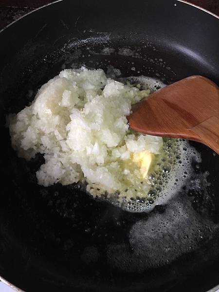 奶油先進鍋裡稍微融化之後,就把切碎的洋蔥丟進去炒香,邊炒最好邊加點水,