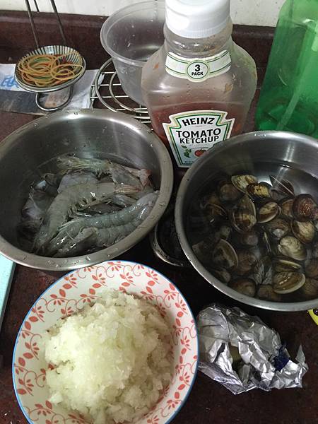 蝦子可以在生的時候就先把殼剪開撥掉~可是我只撥了幾尾就好懶...所以放棄